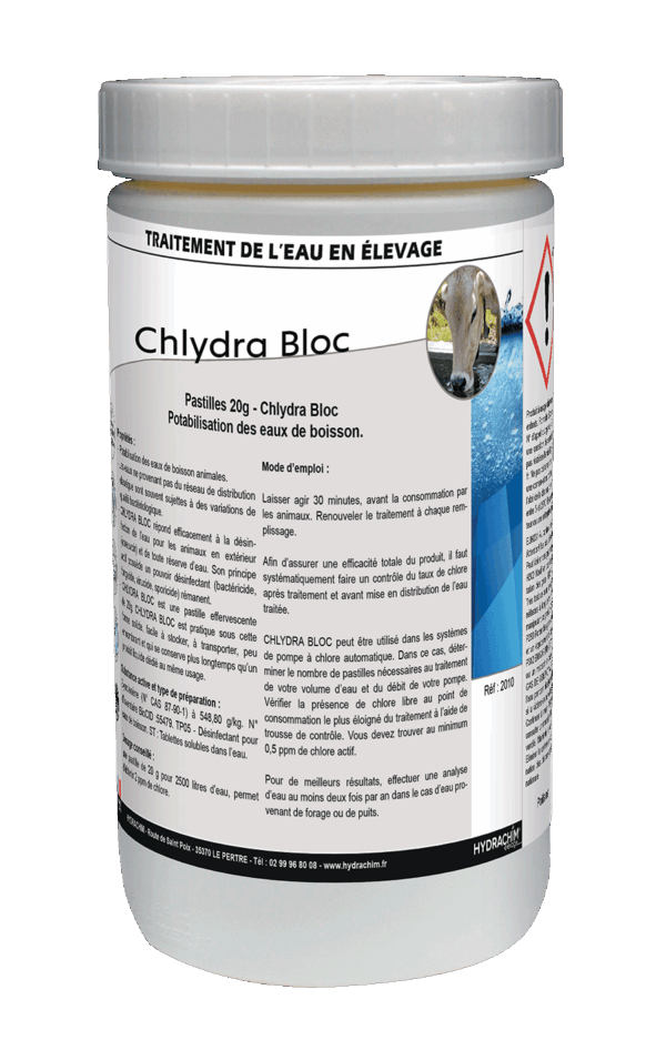 Chlydra bloc est une pastille effervescente, désinfectante et rémanente, qui est destinée au traitement de l’eau de boisson des animaux.