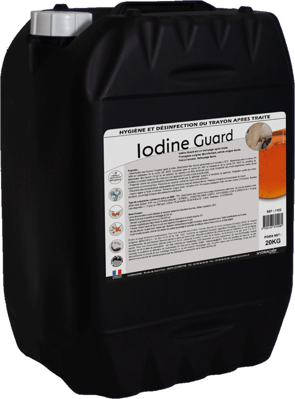 Iodine Guard est un produit prêt à l’emploi à base de polyvidone iodée qui assure la désinfection des trayons tout en leur donnant douceur et souplesse. Il hydrate les trayons, ne goutte pas, obture le sphincter ce qui permet une parfaite protection après la traite pendant la période à risques (premières heures) et jusqu’à la traite suivante. Dans un même temps, les composants du Iodine Guard entretiennent la souplesse du sphincter. Il laisse un film visible jusqu’à la traite suivante.