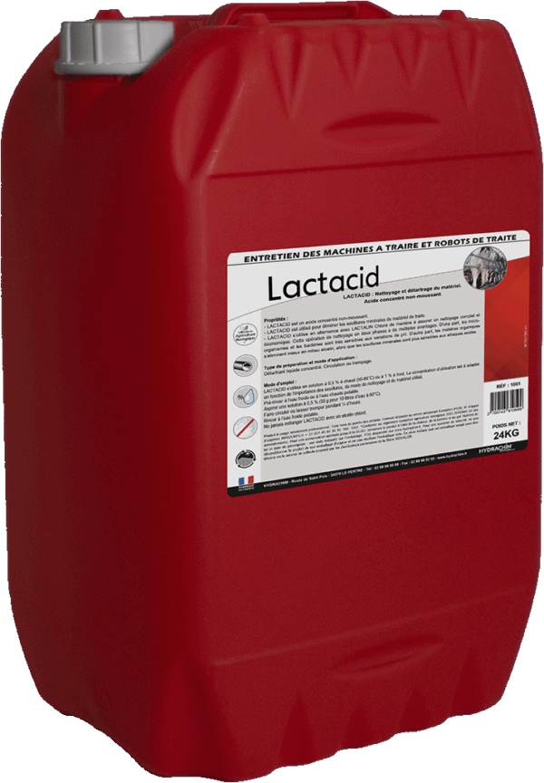 Lactacid est un produit qui utilisé pour éliminer les souillures minérales du matériel de traite. C’est un liquide acide concentré non moussant.