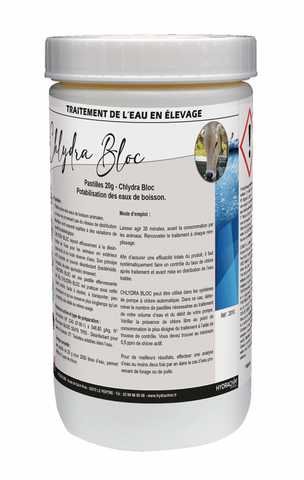 Chlydra bloc est une pastille effervescente, désinfectante et rémanente, qui est destinée au traitement de l’eau de boisson des animaux.