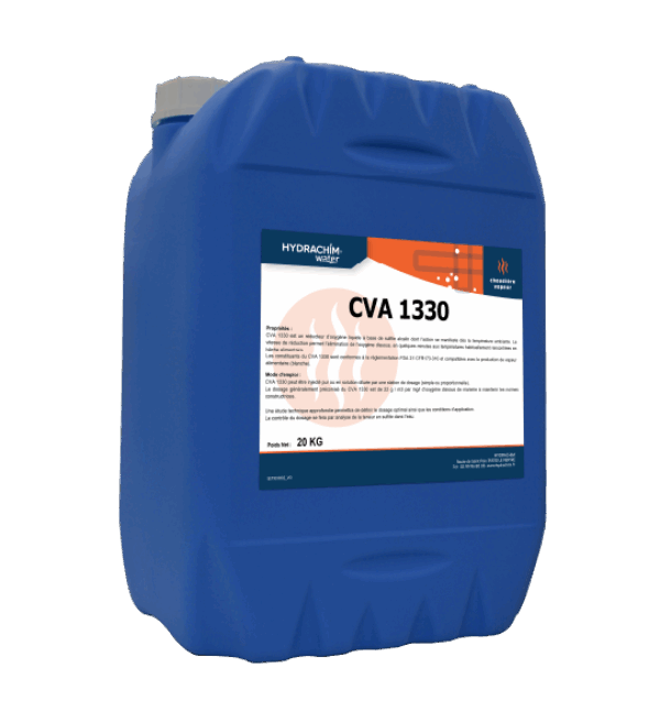 CVA 1330 est un réducteur d’oxygène liquide à base de sulfite alcalin dont l’action se manifeste dès la température ambiante. La vitesse de réduction permet l’élimination de l’oxygène dissous, en quelques minutes aux températures habituellement rencontrées en bâche alimentaire.