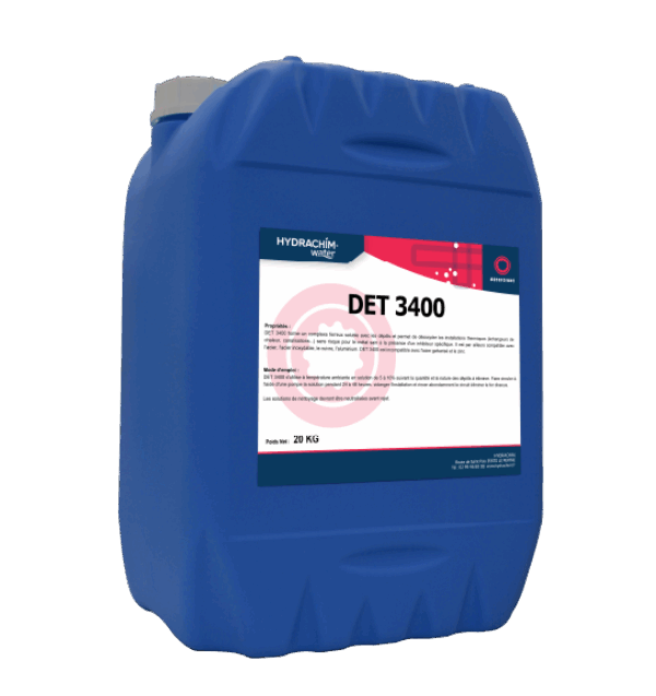 DET 3400 s’utilise à température ambiante en solution de 5 à 10% suivant la quantité et la nature des dépôts à éliminer. Faire circuler à l’aide d’une pompe la solution pendant 24 à 48 heures. Vidanger l’installation et rincer abondamment le circuit pour éliminer le fer dissous.