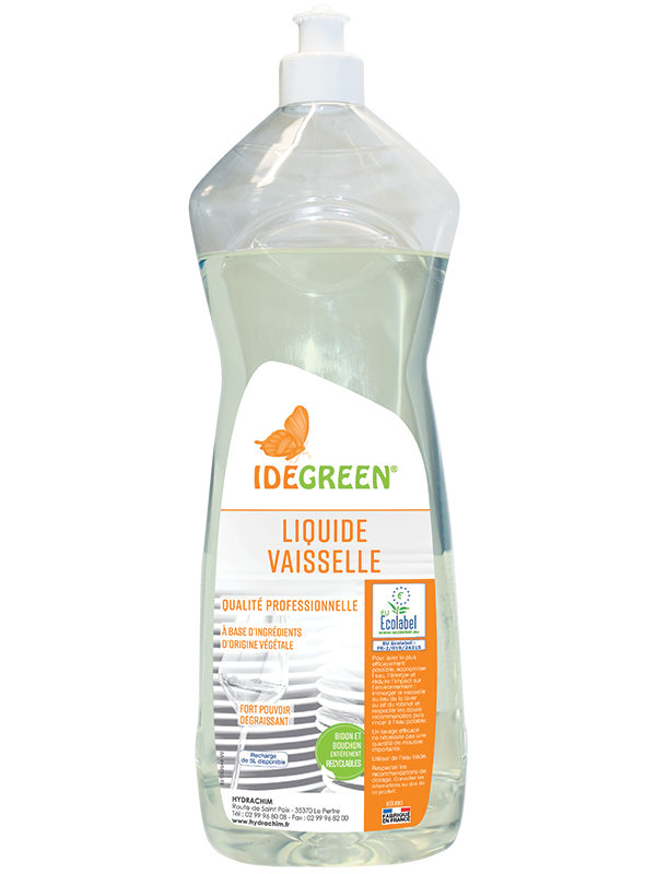 LIQUIDE VAISSELLE écologique IDEGREEN nettoie et dégraisse tous les types de vaisselles.